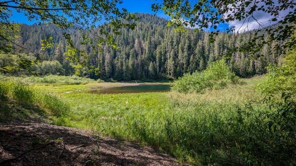 The camping area is at the west end of the lake, and I imagine it would be very swampy earlier in the year. This end is relatively flat and clear, with room for several tents.